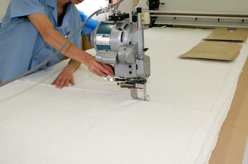 裁断された生地を、1枚ずつ手作業で縫製していきます。